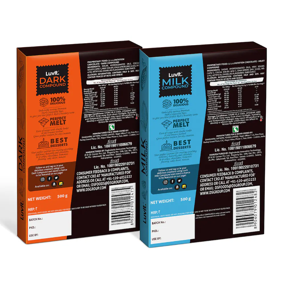 LuvIt cocoa crush compound slabs are extremely delectable and ideal choice for home baking and commercial use. This combo pack of 2, offers milk and dark chocolate variant, 500 gms each. Luvit cocoa crush compound slabs don’t compromise on taste and quality, making them your perfect choice for making desserts, chocolates, cakes and baking decoration.